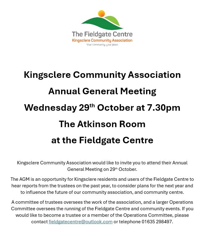 The Fieldgate Centre is operated by Kingsclere Community Association, a charity run by volunteers. We need your help to make sure the centre continues to be a place that the community can use for a wide range of activities and to run events for the community. If you feel that you can spare a few hours now and again to help with organising events, or with DIY/decorating, please call the office – your help will be worthwhile, appreciated, and you’ll probably enjoy it!